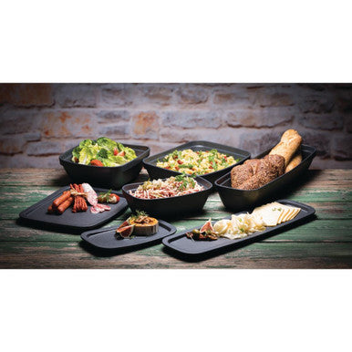 Cast-iron-effect buffet and tabletop pieces made from lightweight yet extra durable melamine.