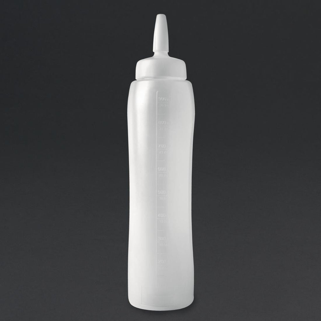 Improve your presentation with the Araven 1 litre clear sauce bottle. Designed with a continuous line nozzle, the bottle helps you apply precise doses of sauce to create impeccably arranged dishes. The nozzle can also be cut to achieve different thicknesses to give you more control over your presentation. Microwave safe, the bottle can store hot and cold sauces to give you more choice when it comes to presenting your meals. Finished with ml and oz measurements, the bottle also helps you control your portions effectively.