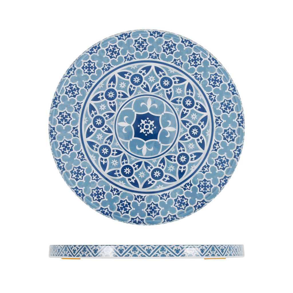 Our on-trend Blue Moroccan tile effect melamine round display slabs allows you to display your food on a 100% food safe melamine platter and measures 285mm in diameter.The Marrakesh round display slab Moroccan blue tile effect melamine slab is 100% food safe and easier to manage than a real tile, being dishwasher safe coupled with being extremely durable, making it the perfect partner to enhance your food display.Used for both ambient and chilled, our Marrakesh Moroccan tile effect display slabs are perfect for presenting cupcakes, croissants to cheese.The durable and food safe Marrakesh collection is on trend food display solution and comes in a wide range of different sizes.