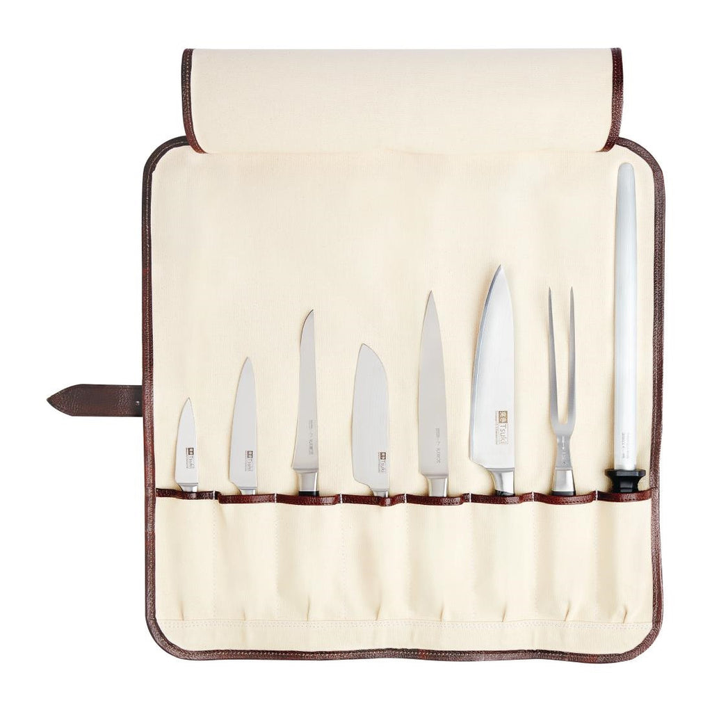 This exquisite knife bag from Boldric is constructed with water buffalo hide and canvas lining, giving it an authentic and unique design. Featuring a beautiful brass buckle to keep everything in place on the go, this knife bag is perfect for travelling chefs or those that like to store their knives in a protective case.