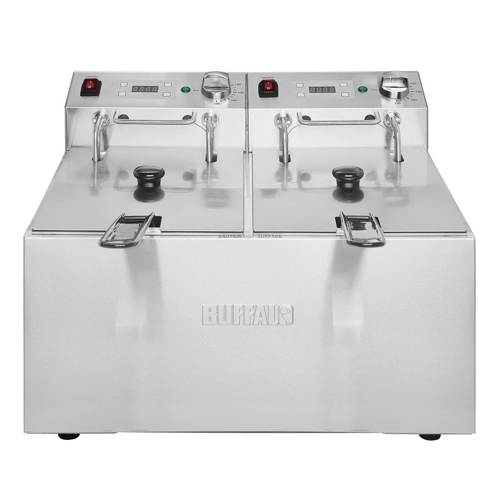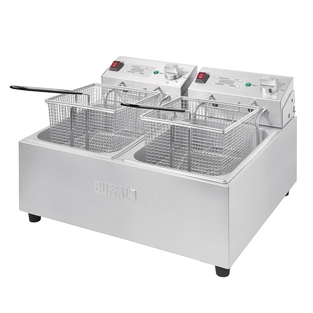 Whether you're frying fish or French fries, the Buffalo twin tank countertop fryer is the ideal solution for everyday use in the professional kitchen. With its powerful independent 2.8kW elements and large 5 litre oil tanks, the fryer offers a generous cooking capacity, making it a great option for frying multiple portions of different foods at the same time.