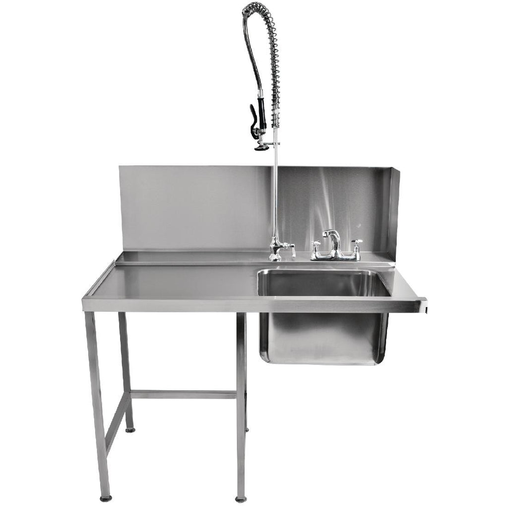 1100mm high pass-through inlet table with sink bowl, splashback, pre-rinse spray and mixer taps.