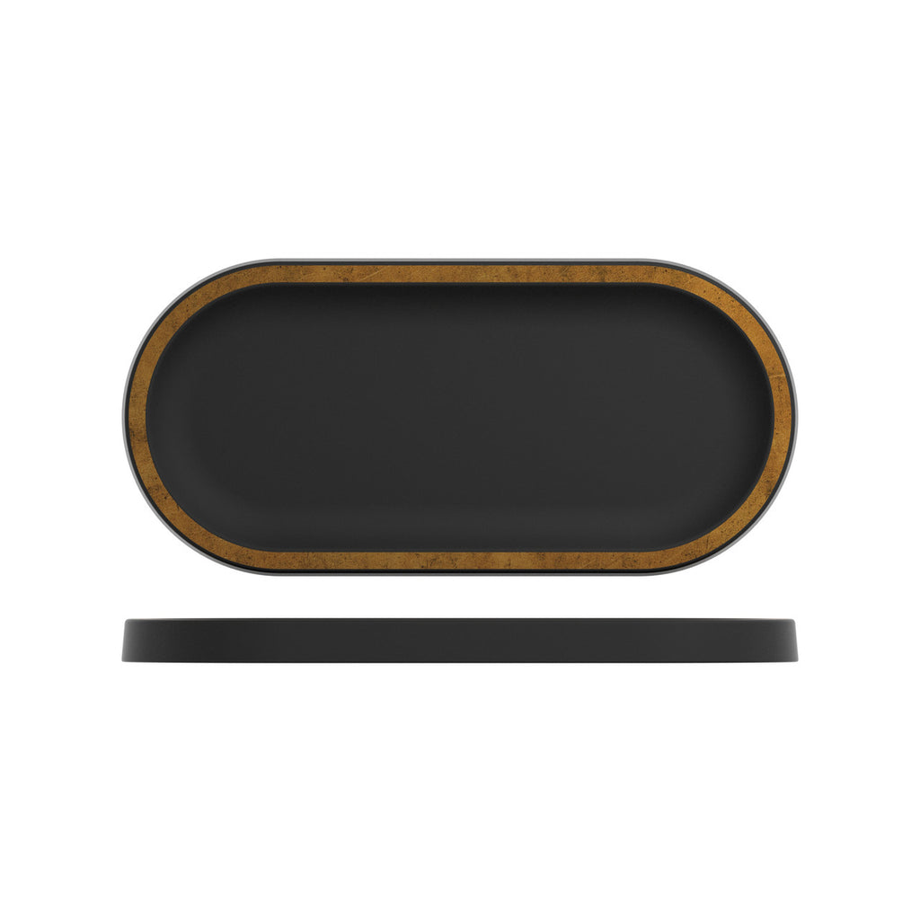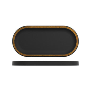 Our beautiful and practical oval matte black with a copper rim melamine tray, allows you to display your food on a 100% food safe melamine platter.The Utah matte black with copper rim melamine oval tray measures 320x150x20mm is 100% food safe and is dishwasher safe and extremely durable, making it the perfect partner to enhance your food display.With a Matte black finish and a copper effect rim, this Utah oval tray is truly an eye-catching food displayware.Ideal for both ambient and chilled food displays our totally unique Utah matte black and copper rim trays are perfect for presenting cakes, sandwiches, pastries, croissants, cheese and much more.Great for buffet, front of house or table top.