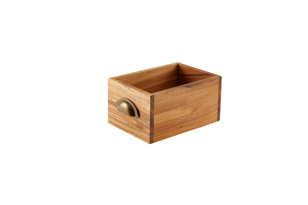 GenWare's Acacia Wood Display Drawers offers a variety of uses in restaurants, coffee shops or as part of a hotel buffet display. It works great as a table caddy, holding cutlery, condiments and serviettes or for stowing sugar packets and coffee stirrers at a coffee shop. Acacia Wood Display Drawer's are designed with attractive brass handles for a vintage look.