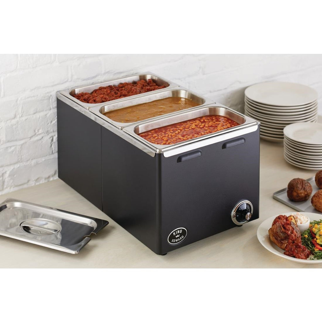 Stylish and reliable British-made wet or dry heat bain marie with powerful 750W concealed element. Black colour.