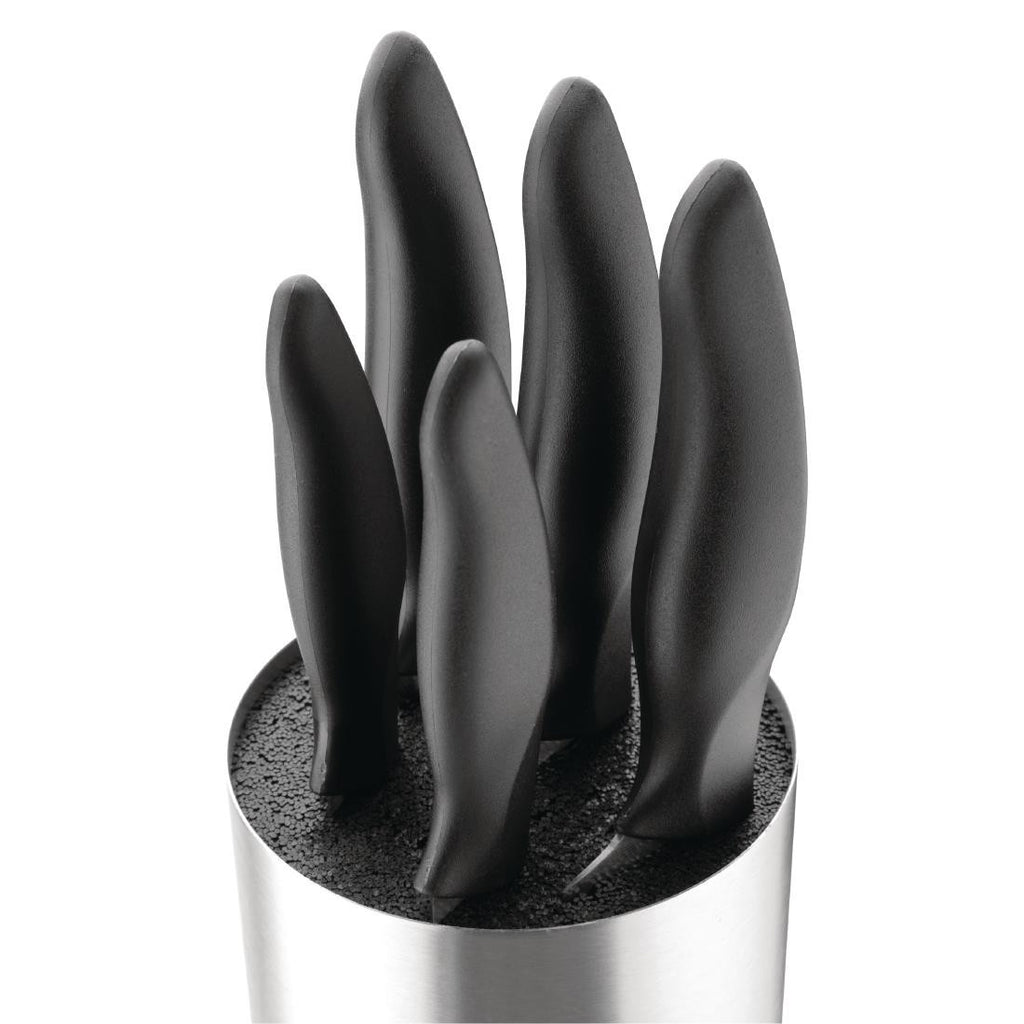 Keep your kitchen organised, and necessities to hand with the Nisbets Essentials knife set. Containing five commercial-grade knifes and a stylish stainless steel knife block, the set safely keeps the knives close to hand and ready to use at a moments notice. Great for maximising efficiency.