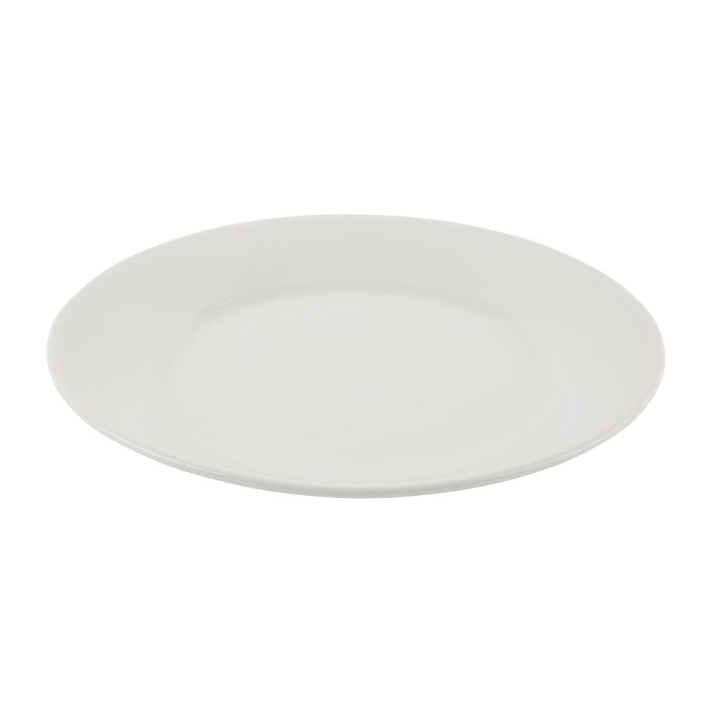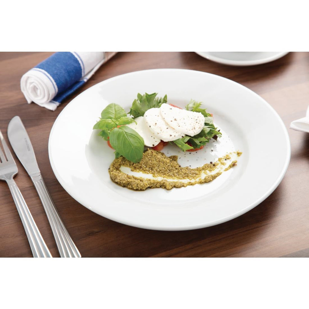Featuring a wide rimmed outer edge for added detail these Olympia Athena 10" porcelain wide rimmed plates offer a simple and clean design for great value, coupled with tough, functional and practical composition. This popular crockery range is ideal for use in pubs, canteens and bistros. This item is guaranteed by the Nisbets Edge Chip Warranty.