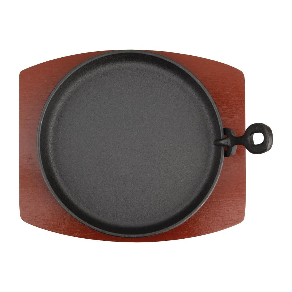 Heavy duty cast iron pans for serving sizzling dishes to the table. Supplied with wooden stands.