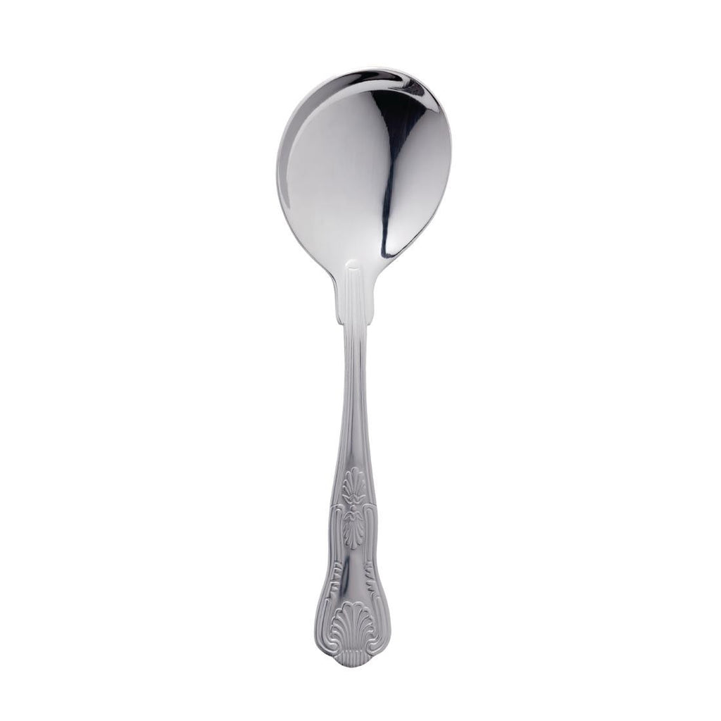 Kings cutlery is one of the most popular designs for restaurants that want a sophisticated look at the dining table and is perfectly suited to establishments that use tablecloths. This soup spoon features a stunning, ornate design on the handle a carries an unusually elegant shape that is comfortable to hold and use, ensuring your customers have the best dining experience possible.