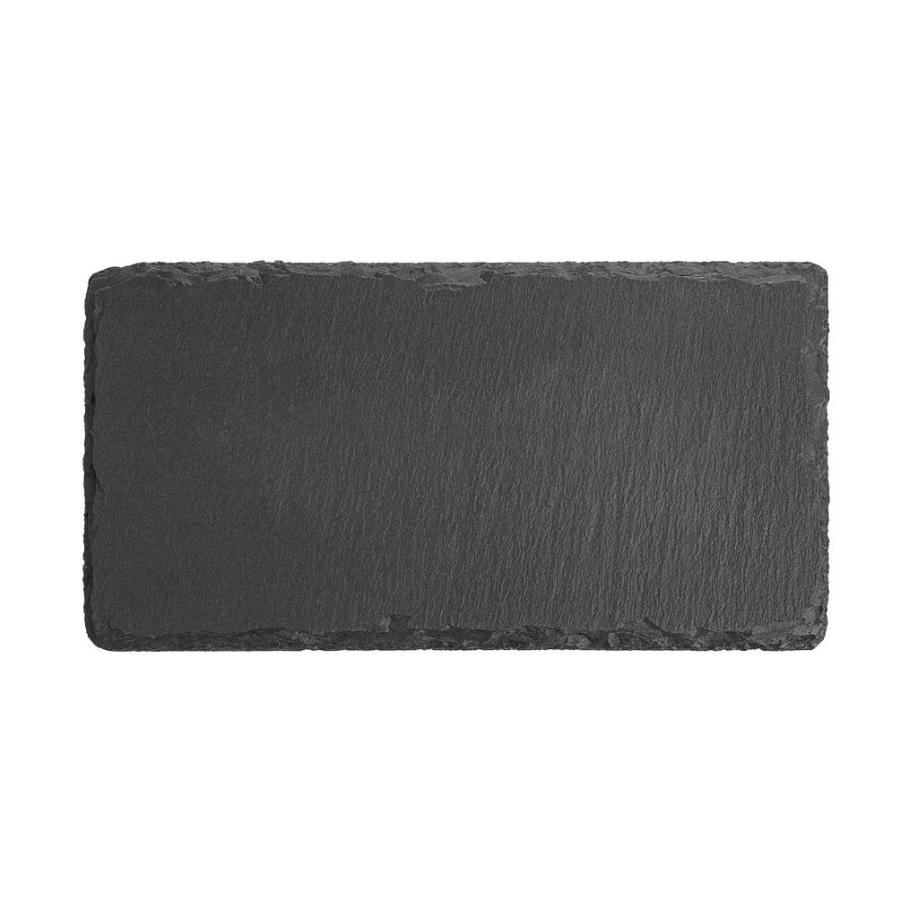 Olympia's food safe contemporary 1/3 gastronorm sized dark slate presentation trays are sealed with a clear varnish, as well as being waterproof, oil and liquid repellent with natural jagged edges, allowing for food items such as sushi and tapas to be displayed and served in a striking way.