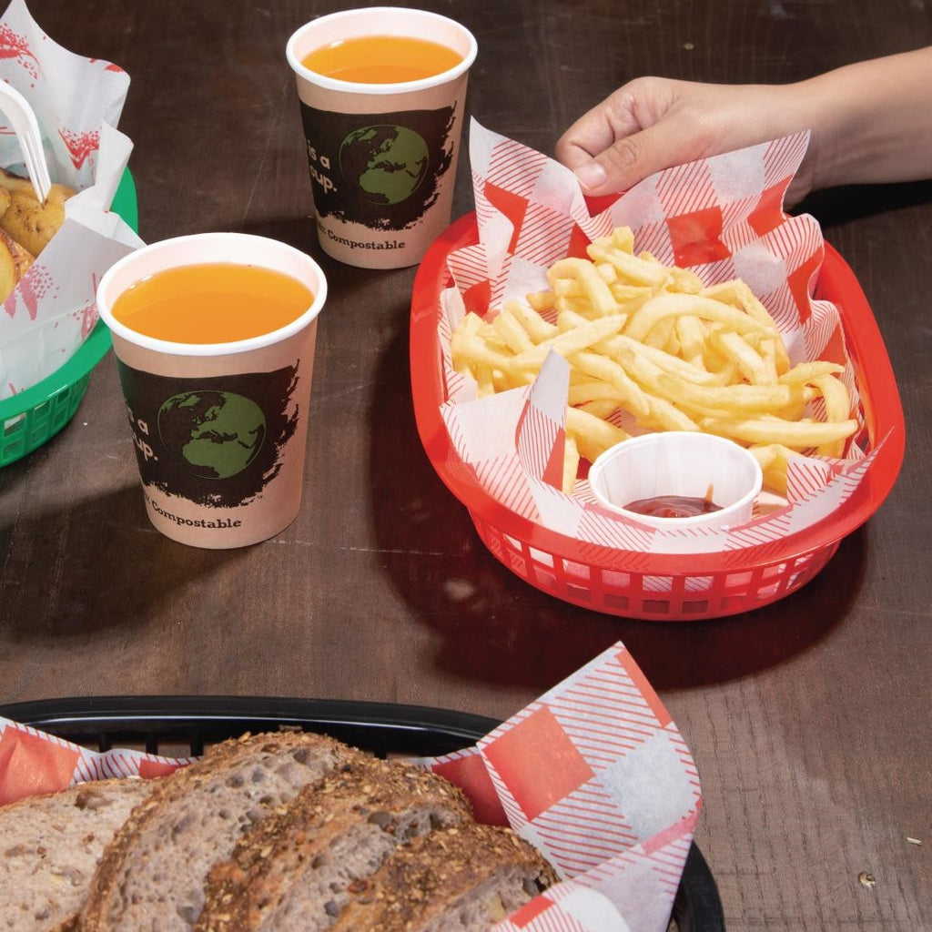 Polypropylene food service baskets. Line with baking parchment for use with chips, burgers, sandwiches, chicken and more.