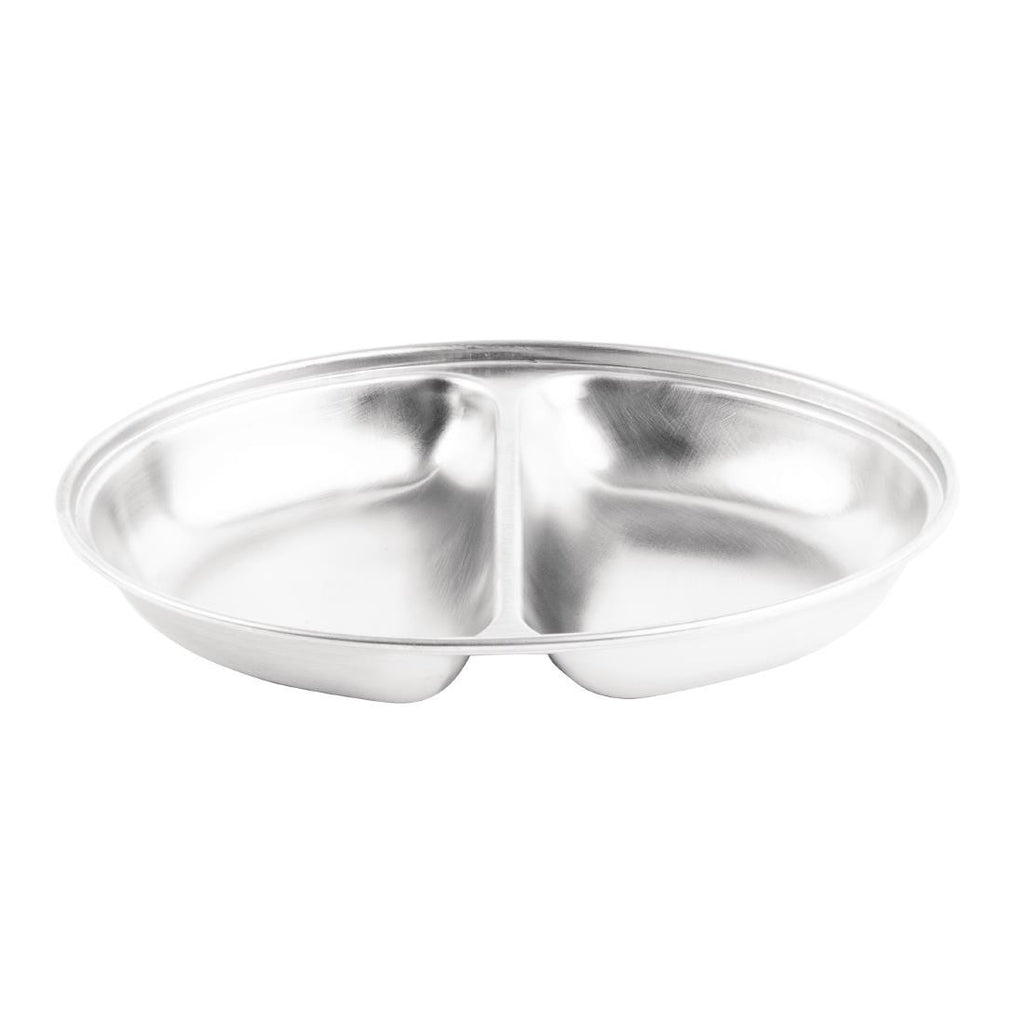 Stainless steel oval serving dish with two divisions. A range of sizes, with lids available separately.
