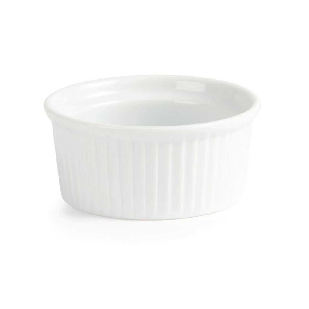 A welcome addition to any table, this versatile ramekin from Olympia is designed to provide a great value and hardwearing porcelain crockery solution for busy hotels, canteens and restaurants. Strengthened rolled edges ensure the ramekin is chip resistant and the fully vitrified body gives great glaze durability, making it ideal to withstand the rigours of the professional catering environment. The ramekin is oven, microwave, dishwasher and freezer proof.