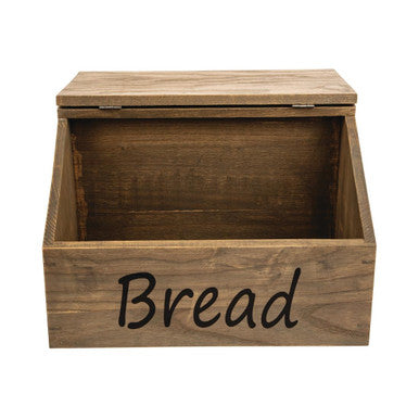 Rustic wooden breadbox with hinged lid for easy self service. The lid keeps food fresher for longer in buffet displays.