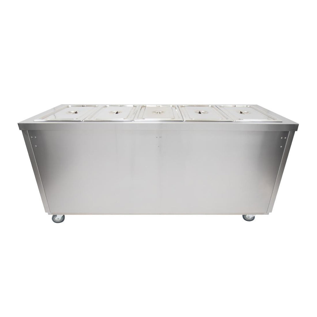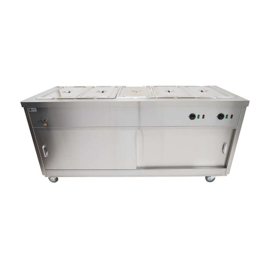 With a bain marie capacity of five full sized (1/1) gastronorms and a capacity of 108 9" plated meals, the Parry HOT18BM hot cupboard has a large enough capacity for care homes, educational establishments and others. The independently controlled bain marie top is versatile and can be configured to use smaller pans if required, meaning real menu variety and choice - especially important when users have special dietary requirements. The mobile hot cupboard is made from double skinned stainless steel, ensuring rigidity, insulation and strength, whilst also being easy to manoeuvre and clean with its sturdy heavy duty castors. The removable sliding doors help save space when the cupboard is being used in confined spaces such as hallways and corridors.