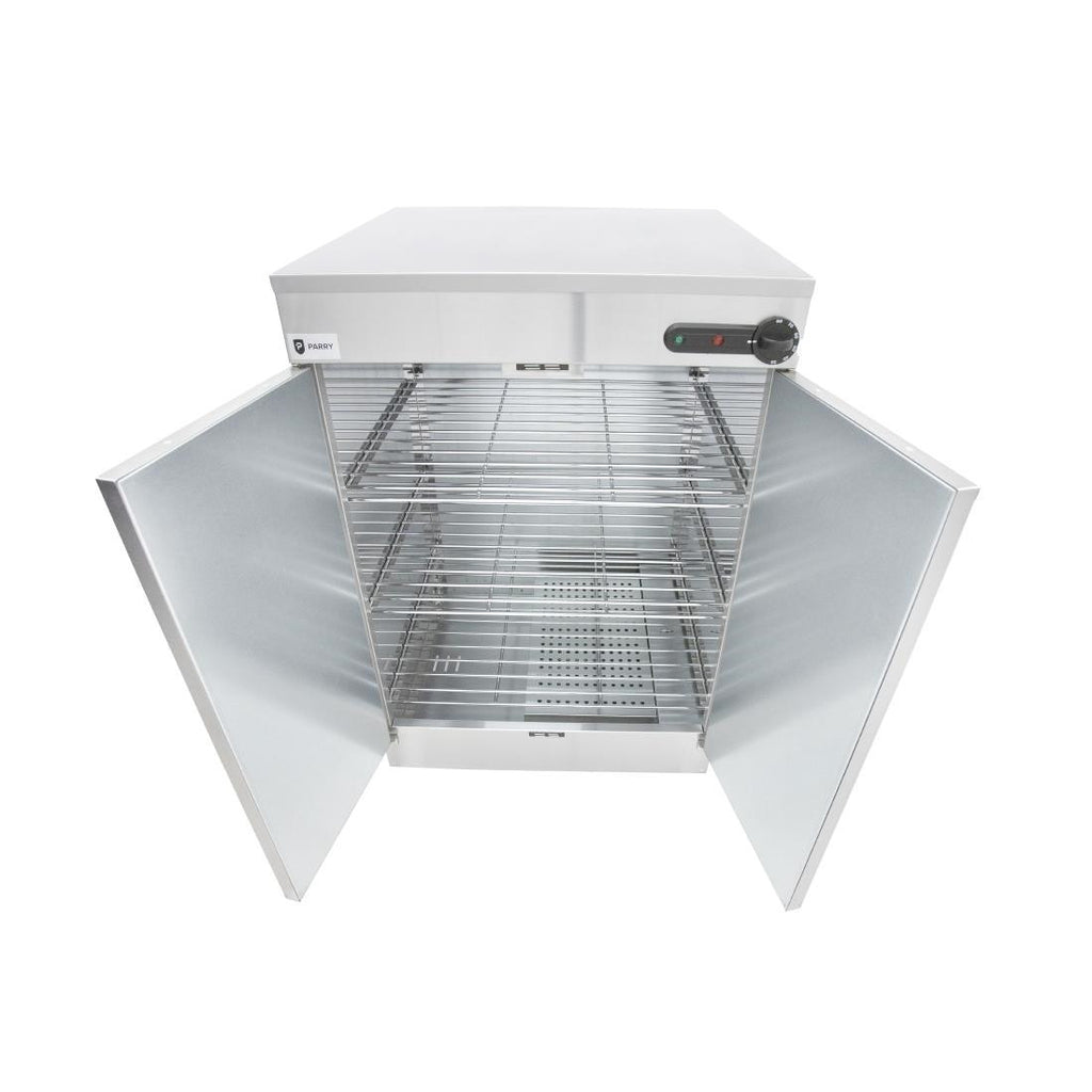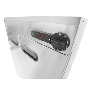 Stainless steel thermostatically controlled plate warmers with chrome wire shelves. Designed to heat plates and serving dishes.
