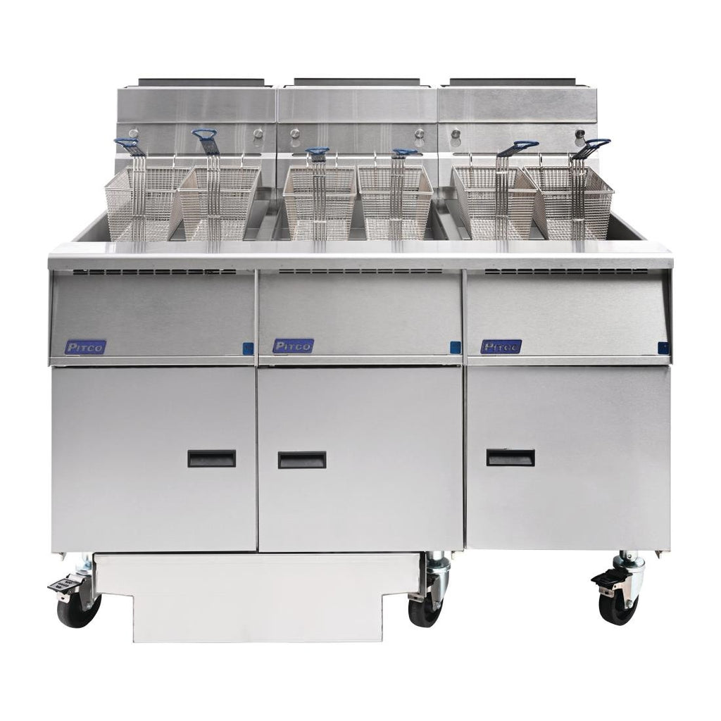 Pitco SGR14S-FD-FFF high production fry suite, tube fryer with built in filtration and patented Solstice Burner Technology. The dependable blower free atmospheric heating system provides fast recovery to cook a variety of food products. The Solstice gas fryer comes standard with a millivolt thermostat with a thermo-safety pilot, high temperature safety limit switch. The unique Solstice burner and baffle design increases cooking production, lowers flue temperature and improves working environment.