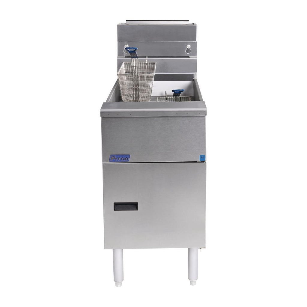 Pitco SG14S tube fryer with the patented Solstice Burner Technology. The dependable blower free atmospheric heating system provides fast recovery to cook a variety of food products. The Solstice gas fryer comes standard with a millivolt thermostat with a thermo-safety pilot, high temperature safety limit switch. The unique Solstice burner and baffle design increases cooking production, lowers flue temperature and improves working