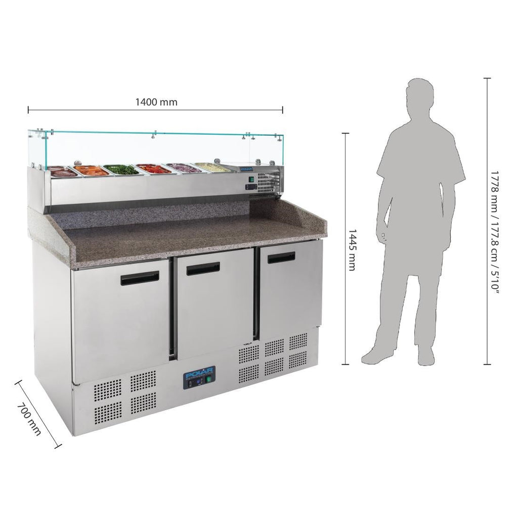 If you're making pizza, salads, wraps, sandwiches or other similar fast-prep foods, the Polar G-Series pizza prep counter provides the ideal reliable refrigerated prep station. A high capacity unit, you can store large quantities of chilled food behind the three stainless steel doors, whilst the sturdy servery unit on top ensures rapid access to frequently used chilled ingredients. The robust marble worktop is absolutely ideal for pizza prep, as the stay-cool material makes kneading dough mess-free.
