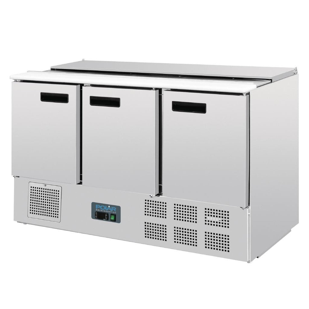 The three door Polar G-Series saladette counter fridge is the ideal high capacity solution for busy kitchens which need rapid access to chilled ingredients. When filled, the top section can fit up to four full size (1/1) GN pans (sold separately)- that's up to 54 litres of storage across the top.