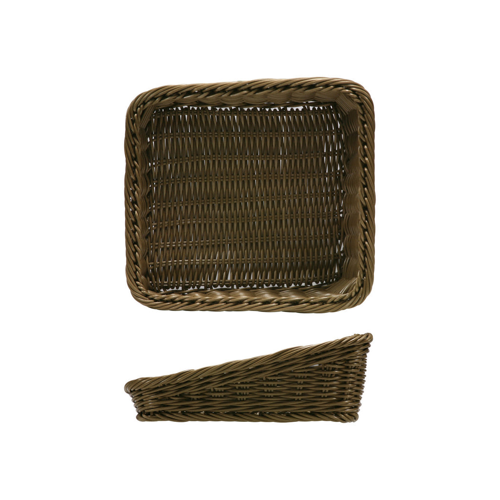 Our angled Lisbon Tray which measures 265x265x100mm is a handmade Poly wicker tray, is a fantastic alternative to real wicker, whilst offering a natural look and feel for your food display. This angled tray is ideal for supermarkets, deli bars and contract caterers to display fruit, vegetables, bread or even used to promote promotional items. This premium basket is 100% food safe, extremely durable and doesn't flake like real wicker.