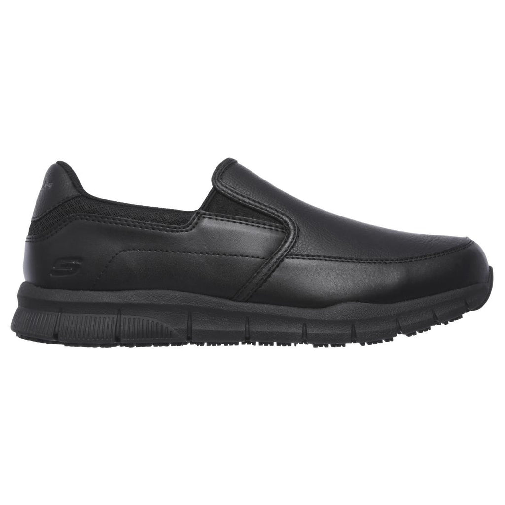 Work smarter and more comfortably with the Skechers Work Relaxed Fit(R): Nampa - Groton SR shoe. Smooth leather-textured synthetic upper in a slip on sporty casual comfort work slip resistant sneaker with stitching accents and Memory Foam insole.