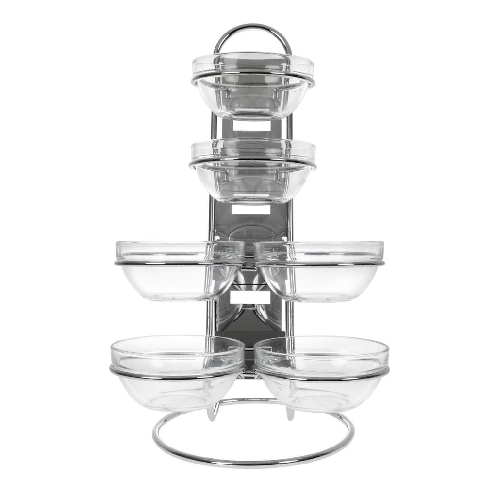 Chrome plated buffet ladders with glass bowls. Ladder sets are supplied with six bowls, two single bowl rings and two double bowl rings (spares and polycarbonate covers available separately). Ideal for buffet use.