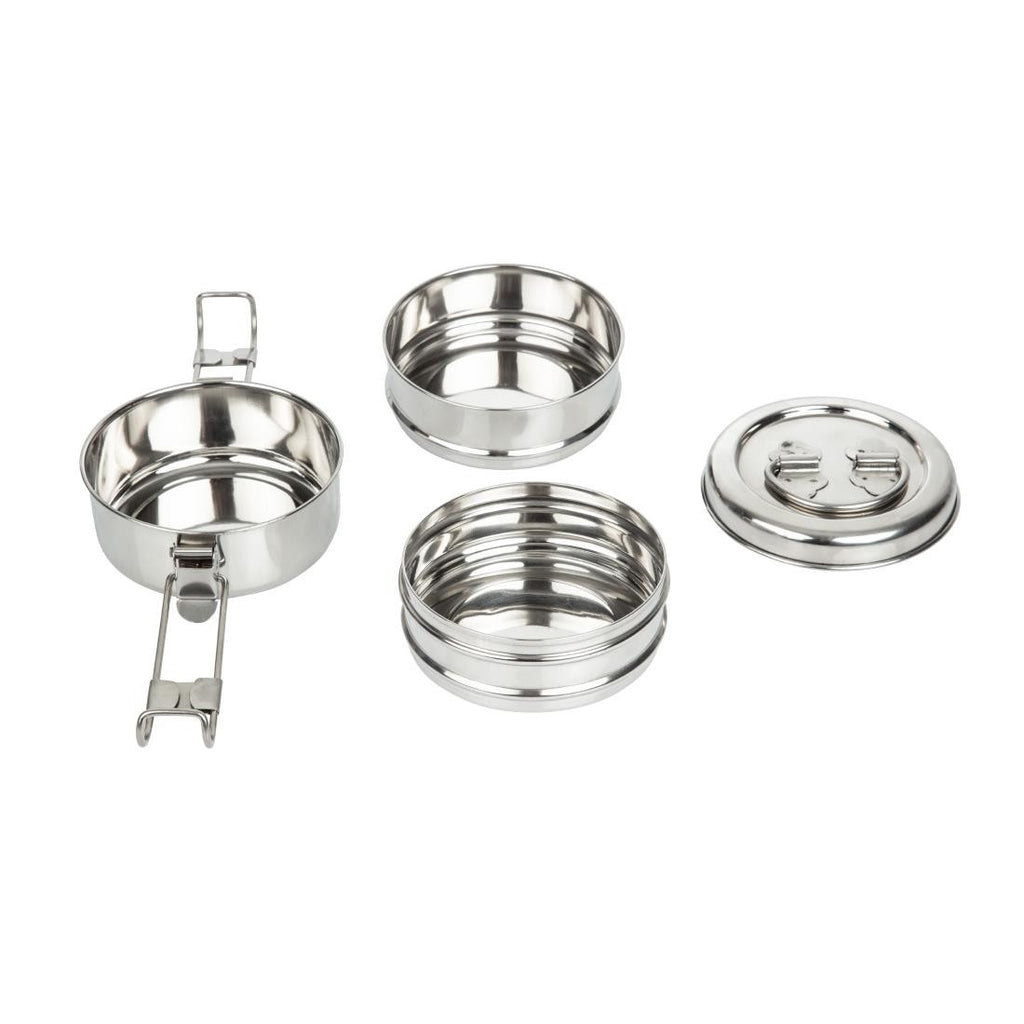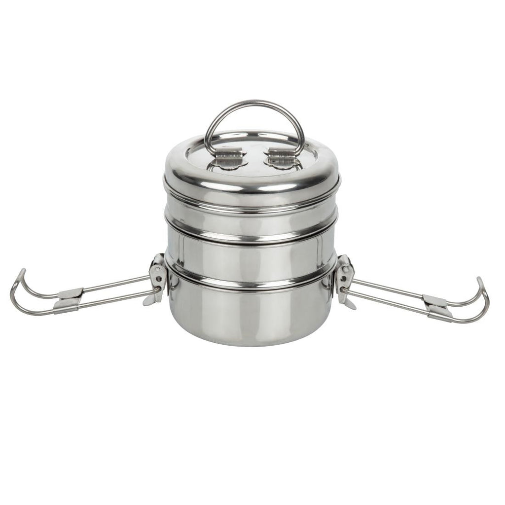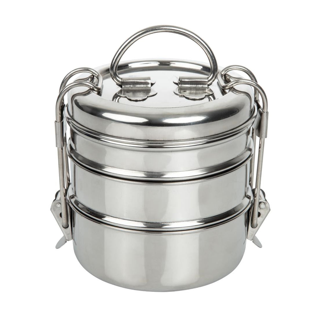 This three layer tiffin box from Utopia is inspired by South Asian lunchtimes and offers an exciting, multiple-level serving solution for a wide range of cuisines. Perfect for serving to table, this stainless steel tiffin closes securely with a clasp mechanism for good heat insulation and can used in dishwashers.