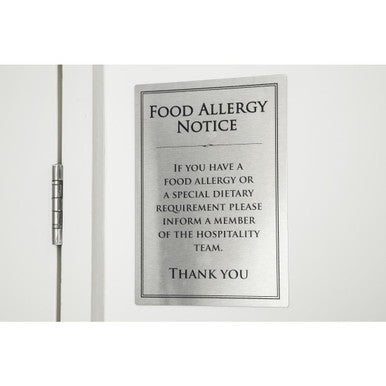 Help to provide clear and impactful information to keep your business safe, with the A4, self-adhesive food allergy sign from Vogue. Thanks to the self-adhesive backing, the sign can be quickly and securely stuck to walls, windows and work surfaces to warn consumers of potential food hazards - helping to keep guests and your reputation safe.