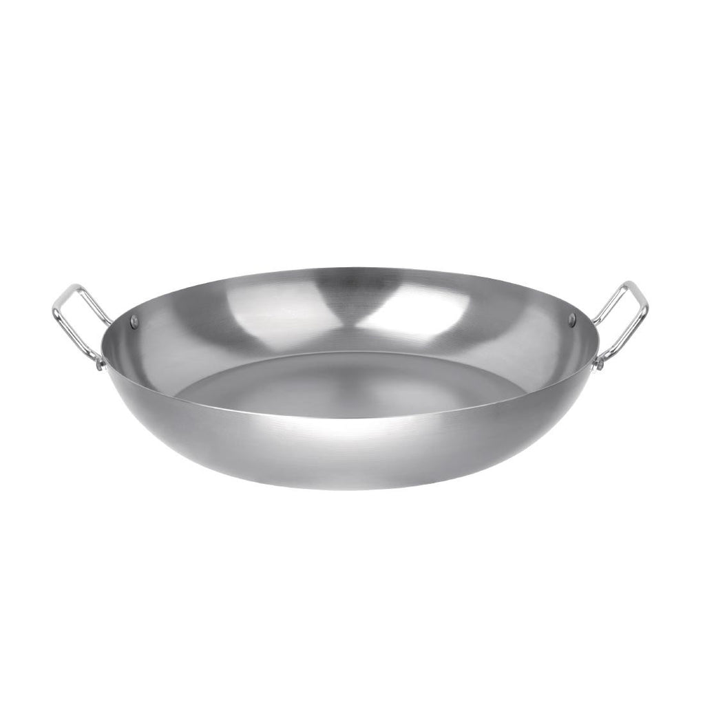 Carbon steel is a perfect material for paella as it absorbs heat slowly and retains it over a long period of time. The heat is distributed evenly, creating the perfect dish. Pans must be seasoned before first use.