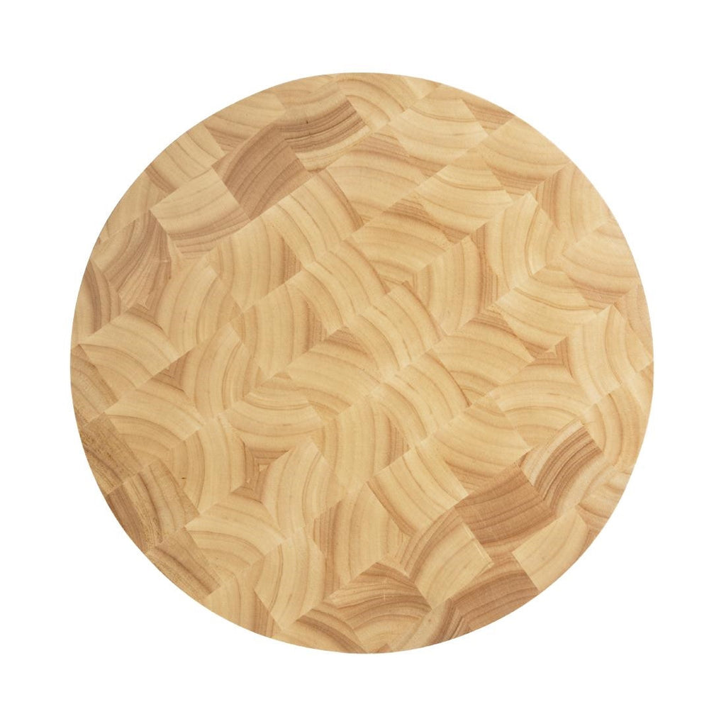 An attractive round, end-grain board. Constructed from multiple blocks of wood that are glued and pressed together under immense pressure. This creates a robust board that will not warp or twist over time, and one that is ideal for all uses in the kitchen. Features finger grooves for easy lifting. An ideal cutting surface for all types of knives as it will not blunt or damage the blade. We would recommend that this board is hand washed and dried thoroughly before storing.