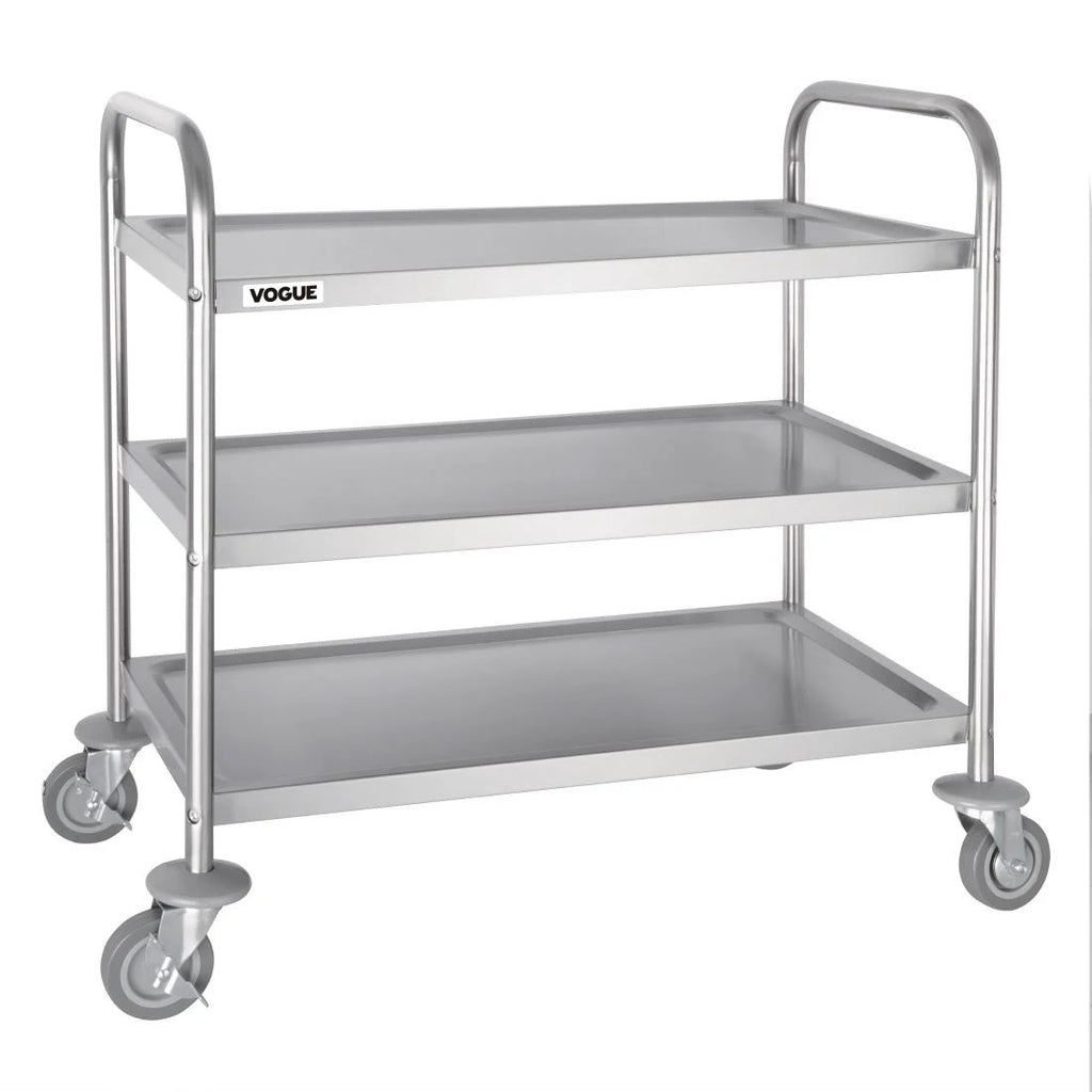 Strong and durable, the medium size three tier Vogue clearing trolley is a great solution for transporting items between areas. Constructed from stainless steel throughout, the trolley is both easy to clean and maintain and provides a hygienic base to transport items, whether that's utensils, plated meals, drinks dispensers, linen or cleaning materials.
