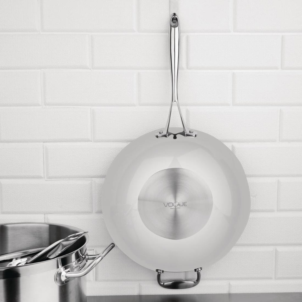Vogue triwall heavy duty fry pan has aluminium thermocore sandwiched between stainless steel walls for even heat distribution without hot-spots. Lids sold separately.